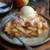 A traditional apple pie served warm with a scoop of vanilla ice cream.