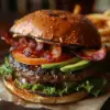 A gourmet burger featuring crispy bacon, fresh avocado slices, lettuce, and tomato on a toasted bun.