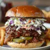 A burger topped with tender BBQ pulled pork, creamy coleslaw, and pickles on a brioche bun.