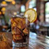 A glass of ice-cold cola with a slice of lemon.