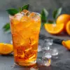 A glass of orange Fanta with ice cubes.