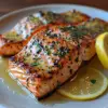A fresh salmon fillet grilled to perfection, served with a lemon butter sauce.