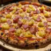 A pizza with tomato sauce, mozzarella cheese, ham, and pineapple chunks.