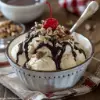 Vanilla ice cream topped with chocolate sauce, chopped nuts, and a cherry on top.