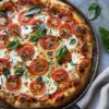 A classic Margherita pizza with a crispy crust, topped with fresh tomatoes, mozzarella cheese, and basil leaves.