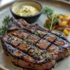 A perfectly grilled ribeye steak with char marks, served with a side of garlic butter and garnished with fresh herbs.