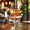A glass of chilled rosé wine.