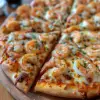 A seafood pizza with shrimp, garlic, and mozzarella on a thin crust.