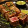 Slices of seared tuna, served rare with a wasabi sauce.